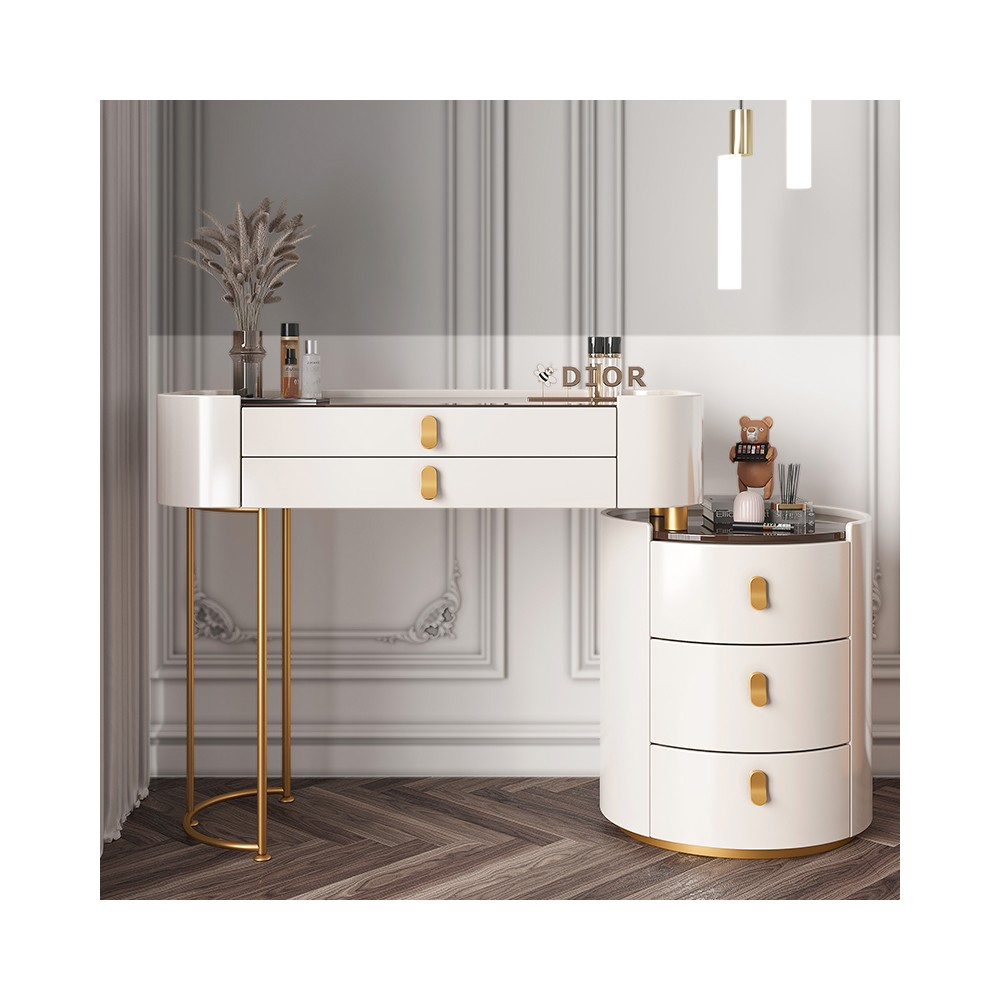 ● Această masă de toaletă are 2 sertare și un dulap de depozitare, oferind suficient spațiu pentru a vă ajuta să vă puneți toate produsele de îngrijire a pielii; cosmeticele, bijuterii, uscător de păr, ondulator și alte articole de înfrumusețare. Unul dintre sertarele mari are compartimente suplimentare care pot fi împărțite pentru depozitarea bijuteriilor.