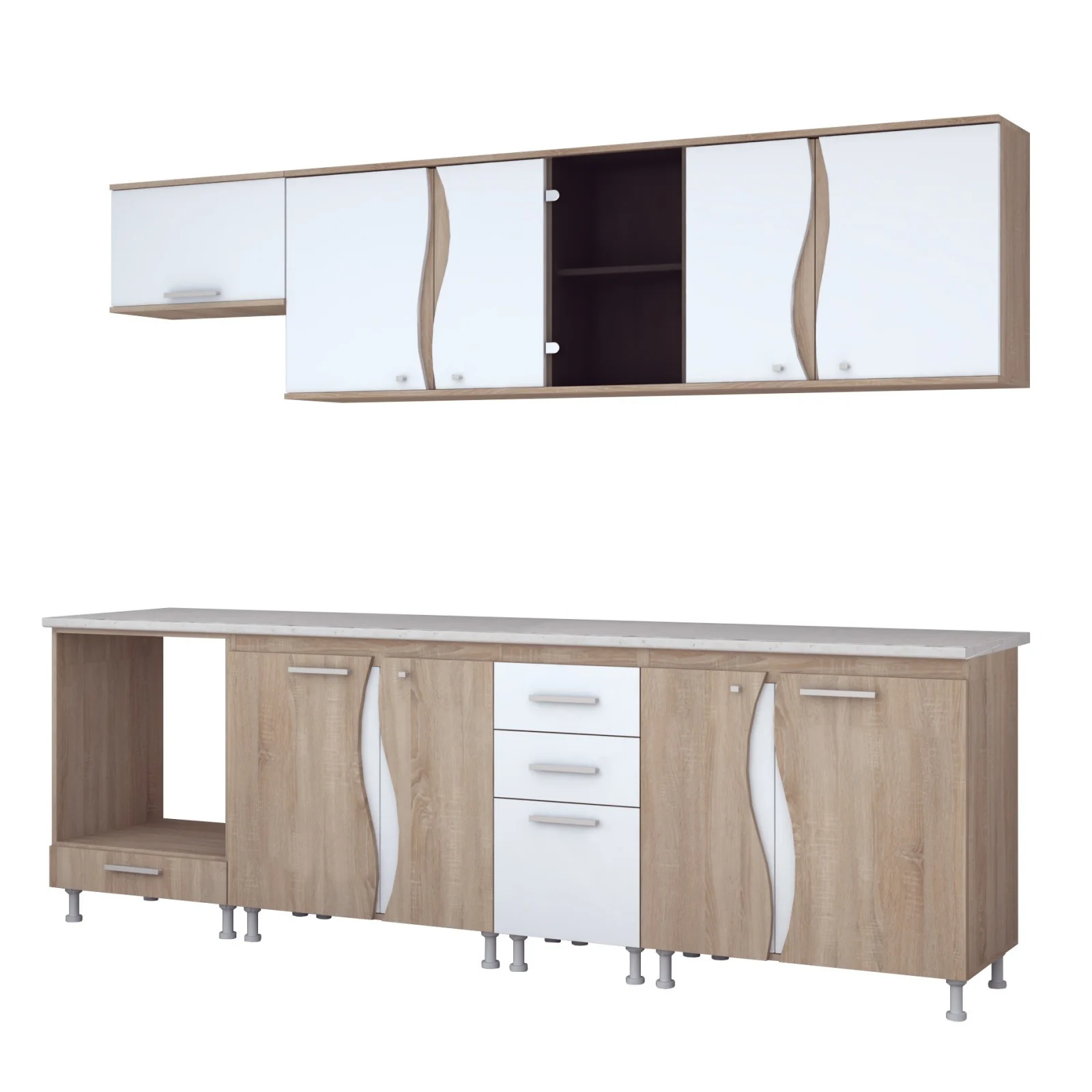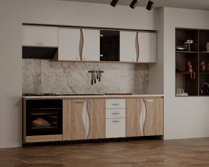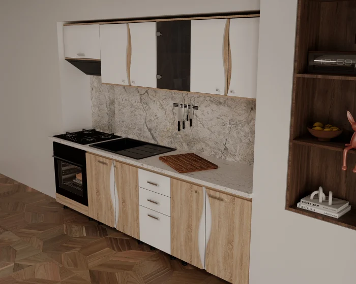 Bucataria este in 2 nuante PAL Sonoma si PAL Alb .Partea Inferioara este formata din 4 corpuri( corp de 80cm cu 2 usi, corp de 40cm cu 2 sertare si o usa, masca de chiuveta de 80 si corp cuptor de 60cm ) iar partea superioara se compune din ( 2 corpuri de 80cm un corp de 40cm cu usa geam si corp de 60 ).