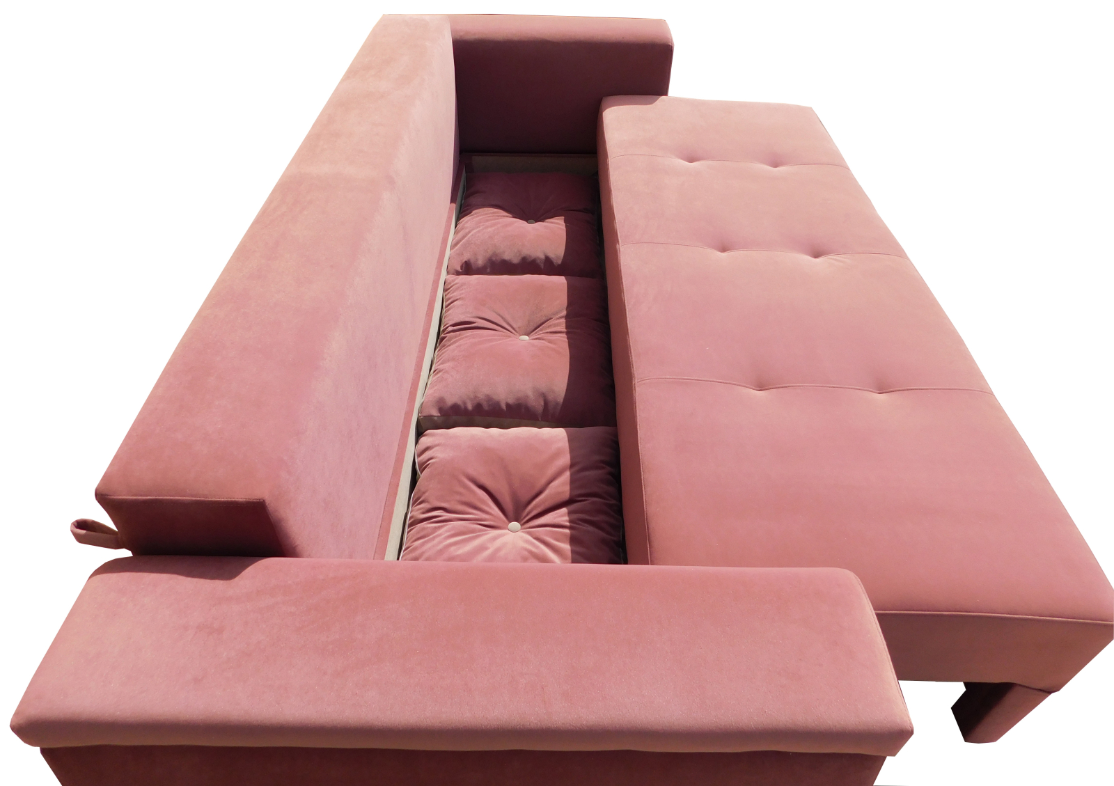 Canapeaua include trei perne decorative,un compartiment de depozitare si un mecanism de extindere care facilizeaza transformarea canapelei intr un spatiu de dormit.