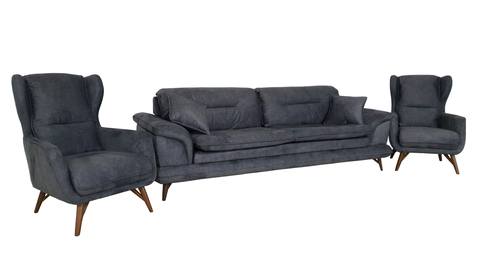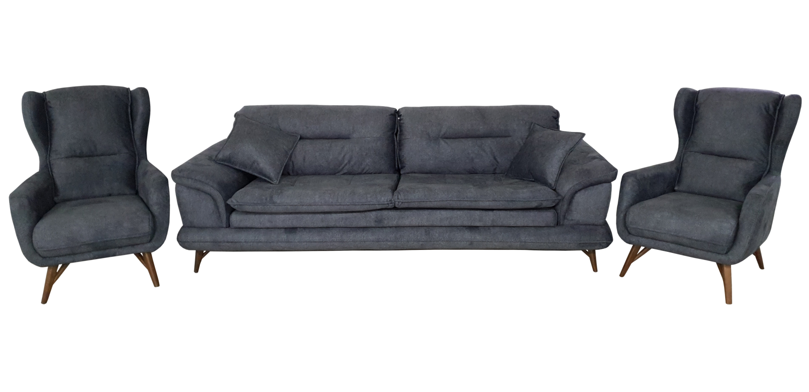 Setul de canapea cu doua fotolii tapitat este un exemplu viu de mobilier de lux.
