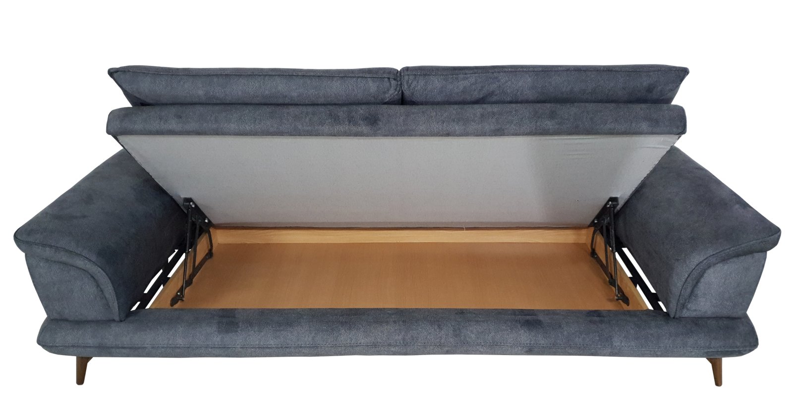 Canapeaua este realizata pe schelete metalic,prezinta lada de depozitare si se poate extinde prin glisarea spatarului.