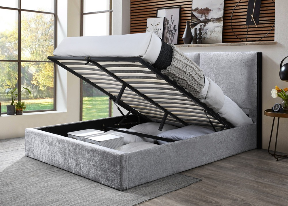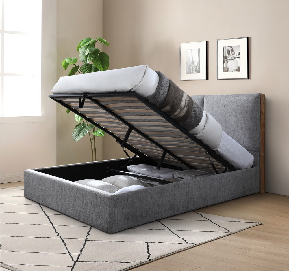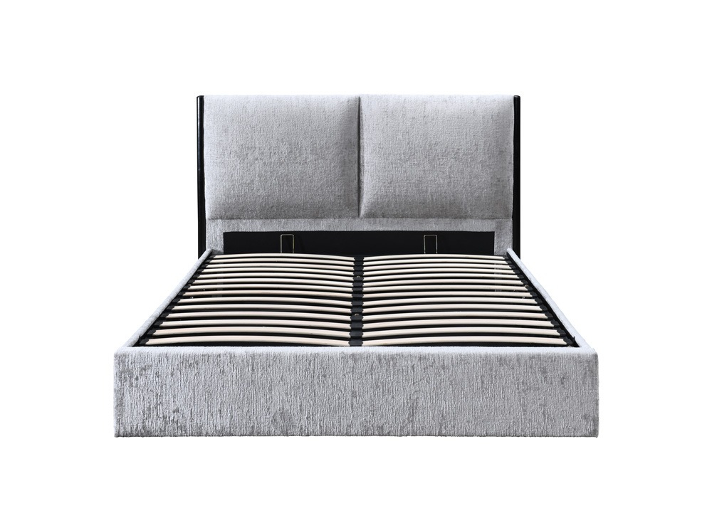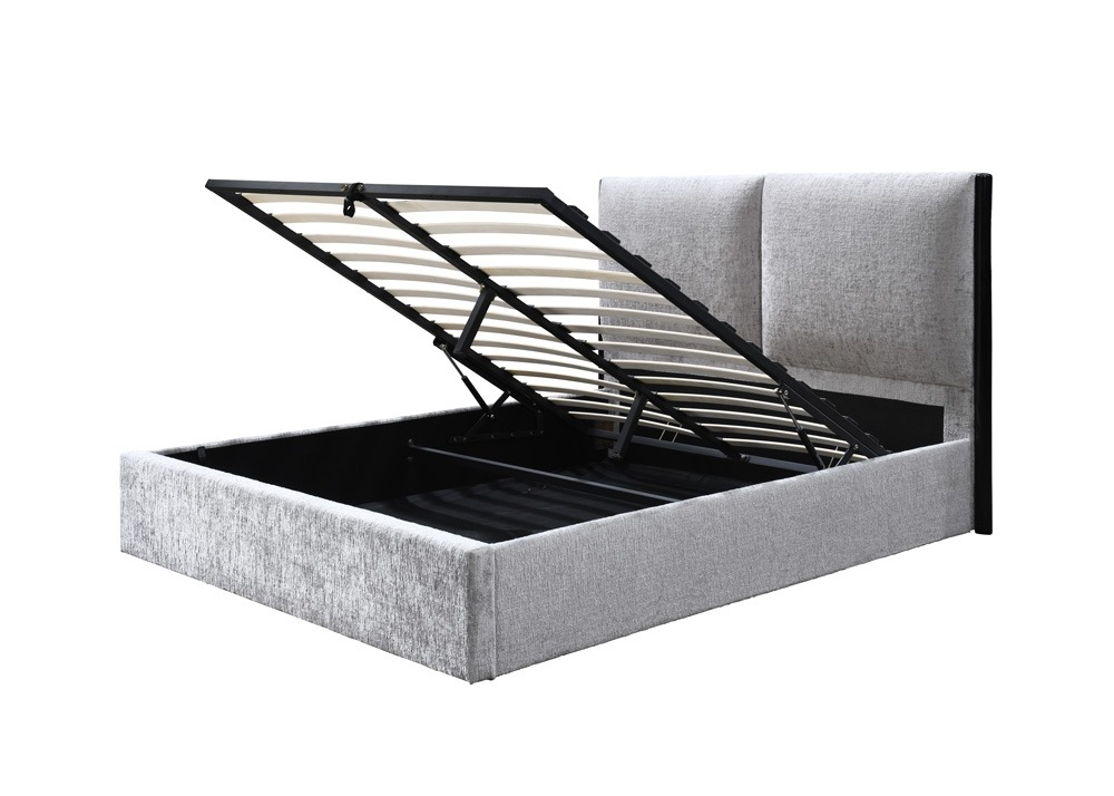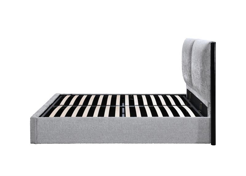 Pat tapitat Nordic, 160x200, cu somiera metalica rabatabila si spatiu de depozitare, culoare Gri