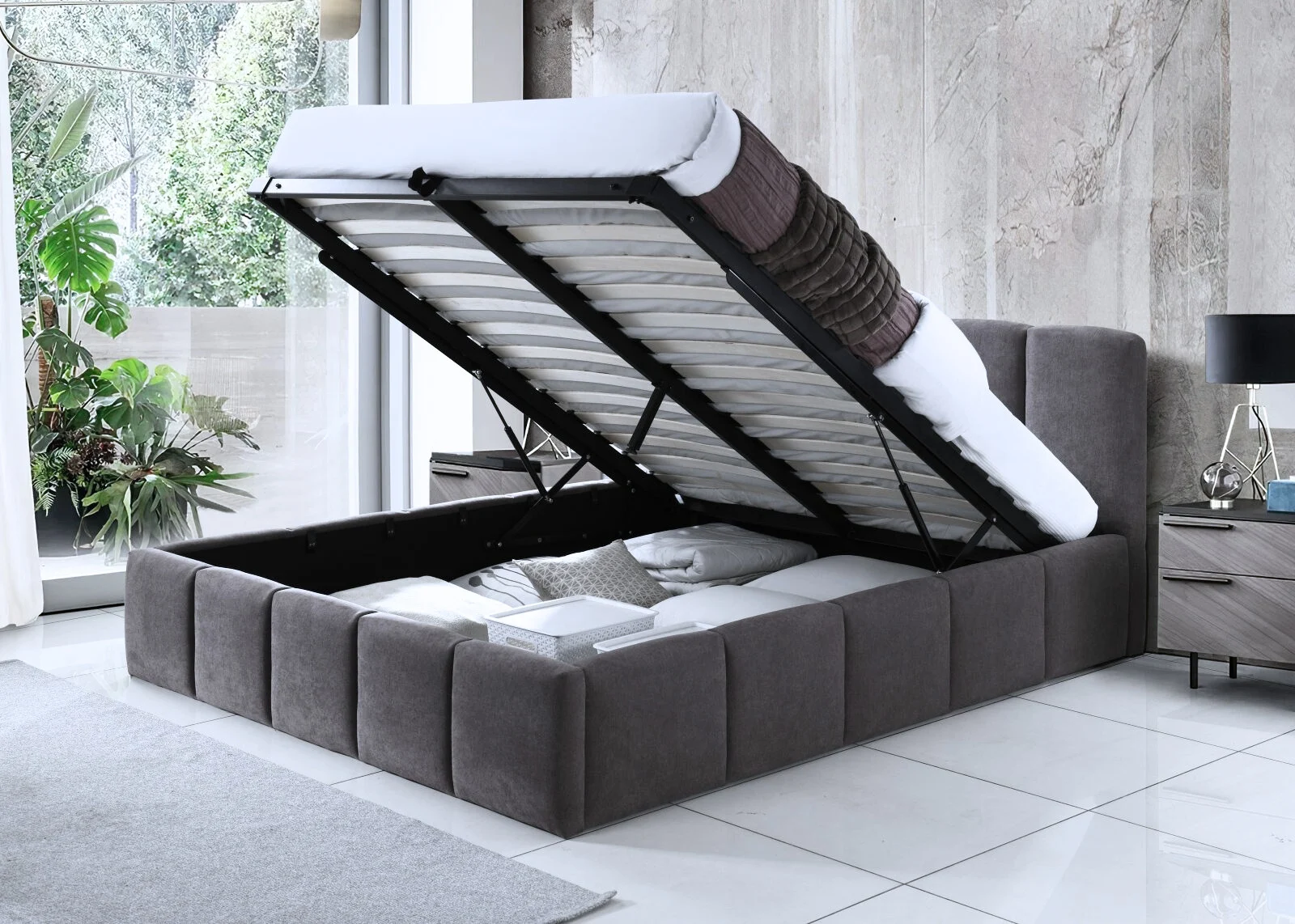 Construit pe o structură solidă și echipat cu somieră rabatabilă cu pistoane de înaltă calitate, patul Cloud oferă un spațiu generos de depozitare, ușor accesibil și rezistent la utilizări frecvente.