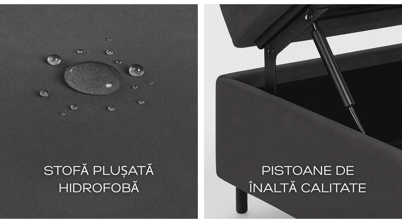Tapițeria este realizată din stofă plusată groasă cu efect hidrofob, care respinge lichidele și se curăță ușor, păstrându-și aspectul impecabil în timp.