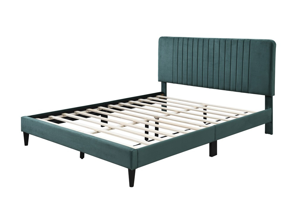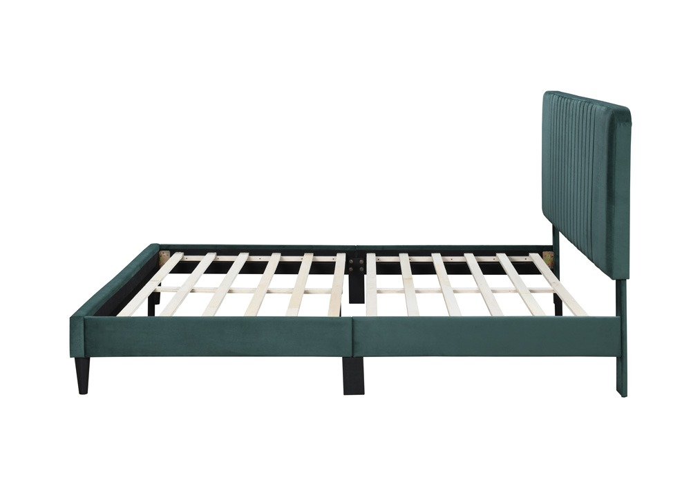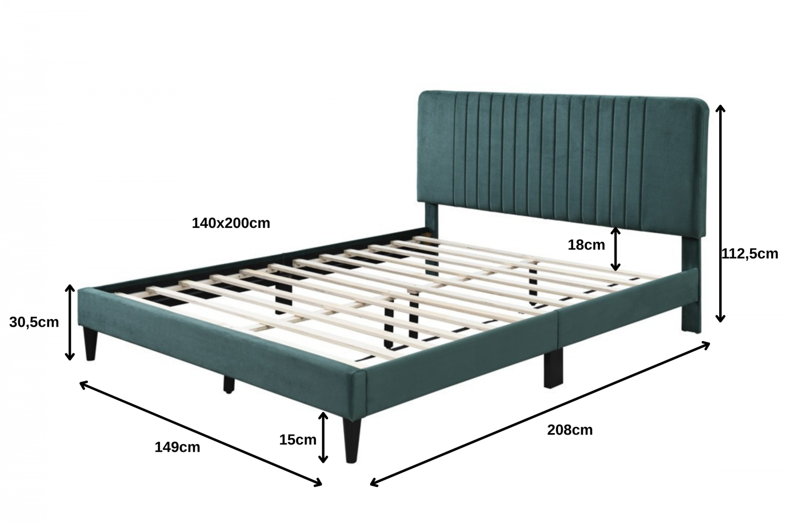 Pat tapitat Emerald cu catifea verde, 140x200, cadru din lemn cu somiera fixa